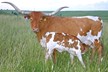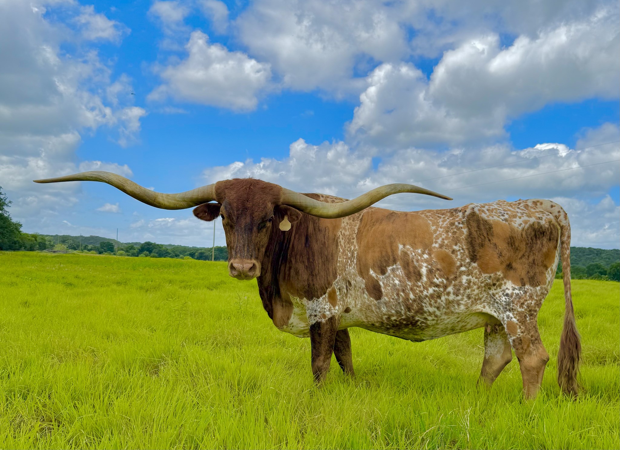 A beautiful Drag Iron daughter just over 90", Dot has the special sauce: twisty sloping horns atop a large sturdy frame. This is the dam of the $275K high seller at 2023 Legends' sale. Seeing her strolling in the pasture is longhorn poetry in motion. That undeniable Drag Iron dot covers her coat with splashy pattern and color. Greatness!!