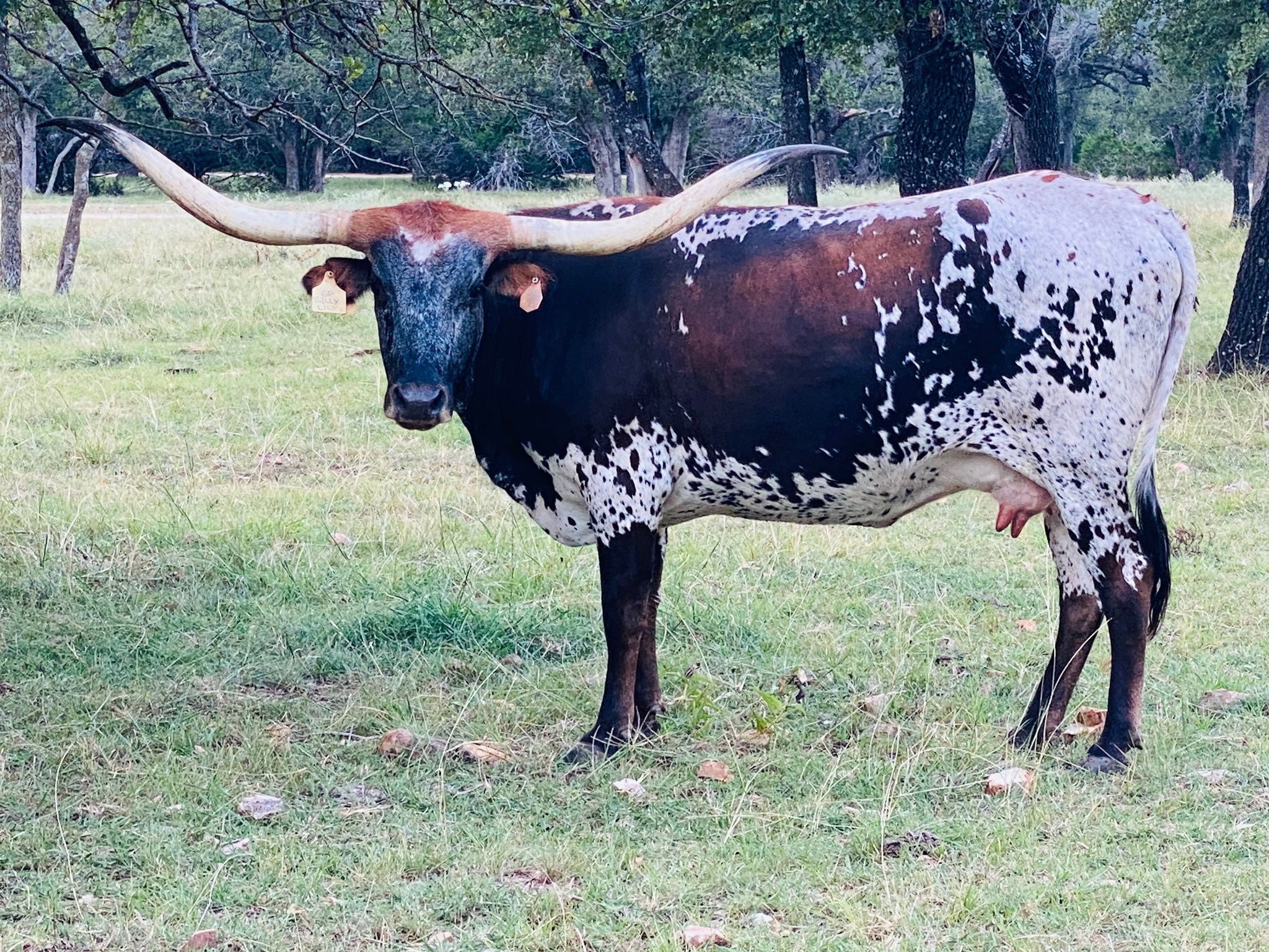 We purchased her from G & P Longhorns in 2021. She is a smaller framed cow who out produces herself every year. Her sire is the great Concealed Weapon, which gives her the twist that we have been patiently waiting on! Her unique coloring is passed on to her offspring, with her 2023 calf, W2 Lil' de Ville, showing tremendous horn growth at a young age.