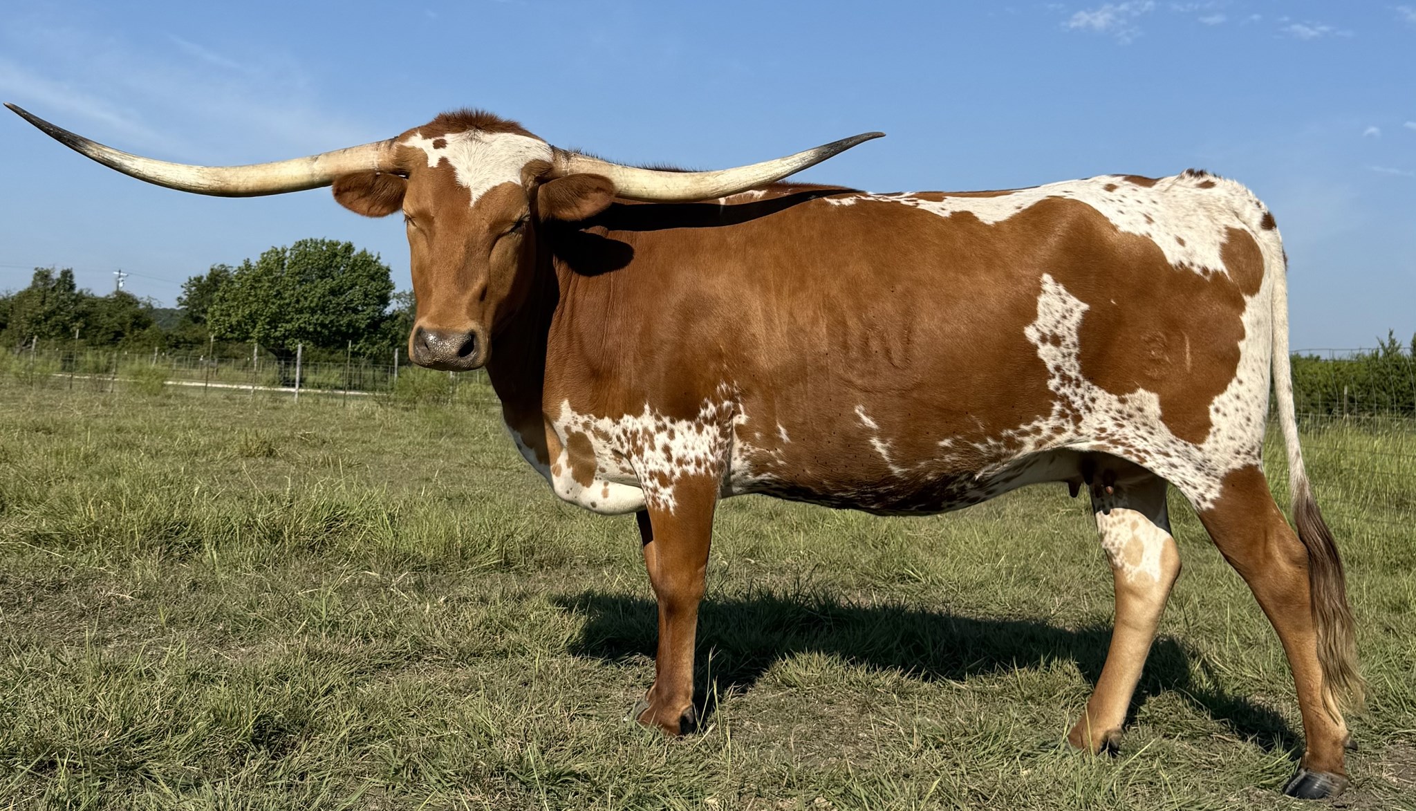 Beautiful elegant cow with stunning genetics. Out of HR J-Gal, 90”TTT, and the highly sought after Rebel HR. Reba is destined to be a winner. Her horns are right-angle straight and growing quickly!! With her round, tall frame and perfect conformation, our girl is the complete package!