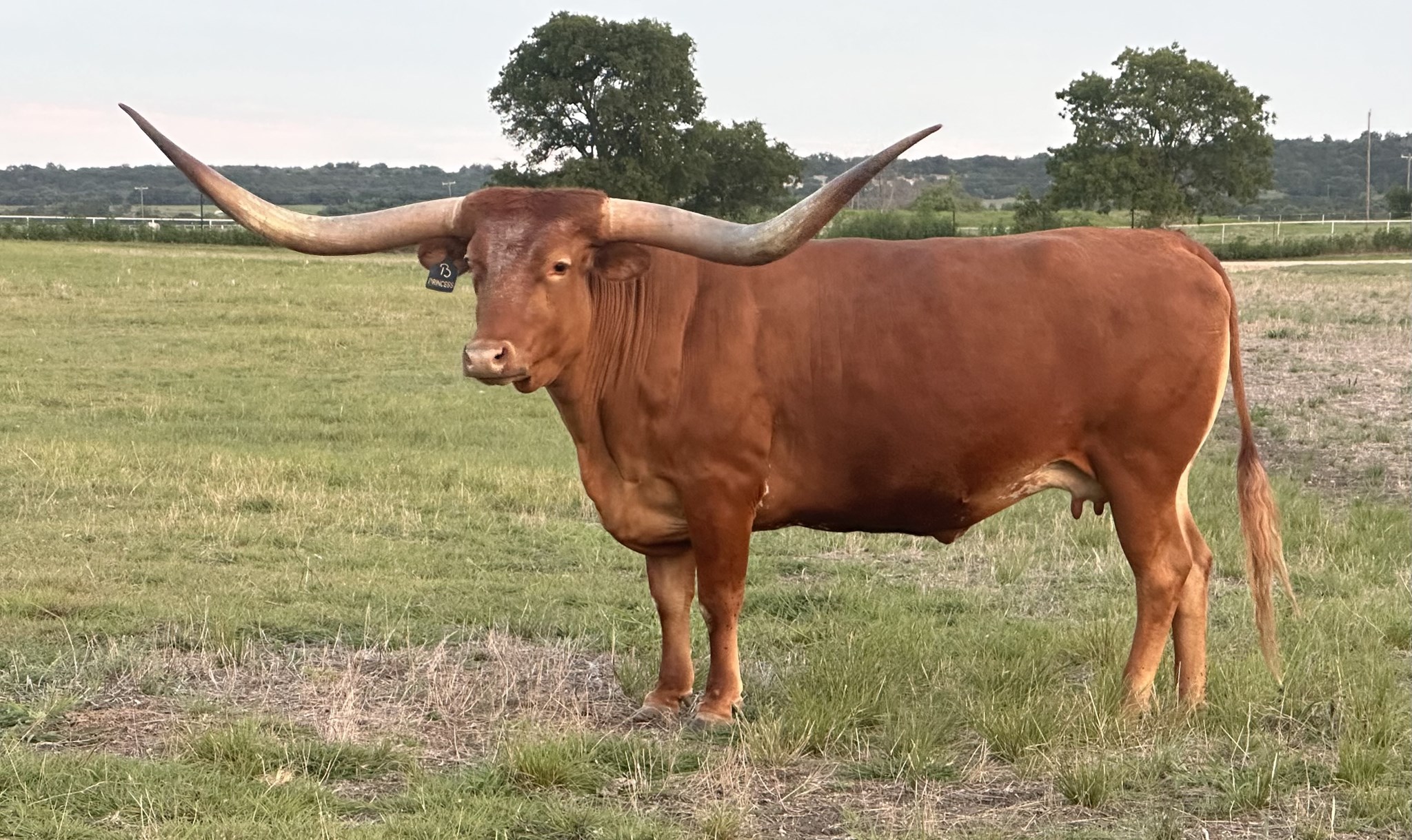 Princess 20 is a beautifully balanced, lateral-horned red cow with a striking white forehead frost she embodies both the elegance and productivity that mark the foundation of the Buxton breeding program. Her sire, 20 Gauge, is one of the most respected bulls in the breed — a son of Concealed Weapon and Hubbells Rio Glory, combining horn, frame, and proven maternal genetics. This side of her pedigree includes breed giants like JP Rio Grande, Horseshoe J Example, and Sharp Shooter 542 — names that are synonymous with elite production and consistent horn growth. On her dam’s side, Hubbells Princess Catchit ties her directly to Cowboy Catchit Chex, one of the most influential sires in the modern era, known for his ability to pass on body, horn, and eye-catching color. This line traces back to Cowboy Chex, BL Rio Catchit, and Hubbells Fantom Princess. Every branch of Princess 20’s pedigree carries champions — a perfect fusion of Cowboy Chex, JP Rio Grande, and Concealed Weapon influence — giving her the genetic foundation to consistently produce exceptional calves.