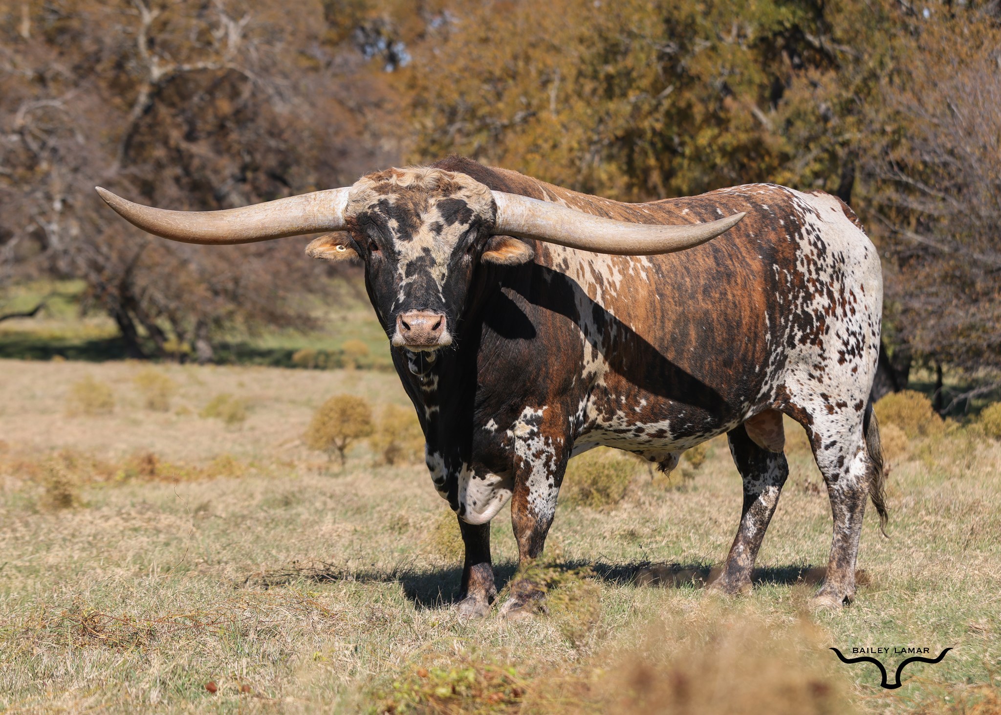 TJ BUX is a wildly colorful, elite breeder bull that brings together legendary genetics, championship credentials, and the ability to produce beautifully built, big-bodied calves with show-stopping color and horn. This outstanding son of the great 20 Gauge carries the influence of Concealed Weapon, JP Rio Grande, and Cowboy Catchit Chex — some of the most respected sires in the Longhorn industry. His dam, Hubbells Tiger Lily, traces directly to Rio Glory and Texas Tiger, adding power and femininity to his genetic base. TJ is a proven producer in the pasture. His calves are everything you want in the next generation: • Big-bodied and structurally correct • Calm, easy-handling temperaments • Splashy, colorful hides with exceptional horn direction