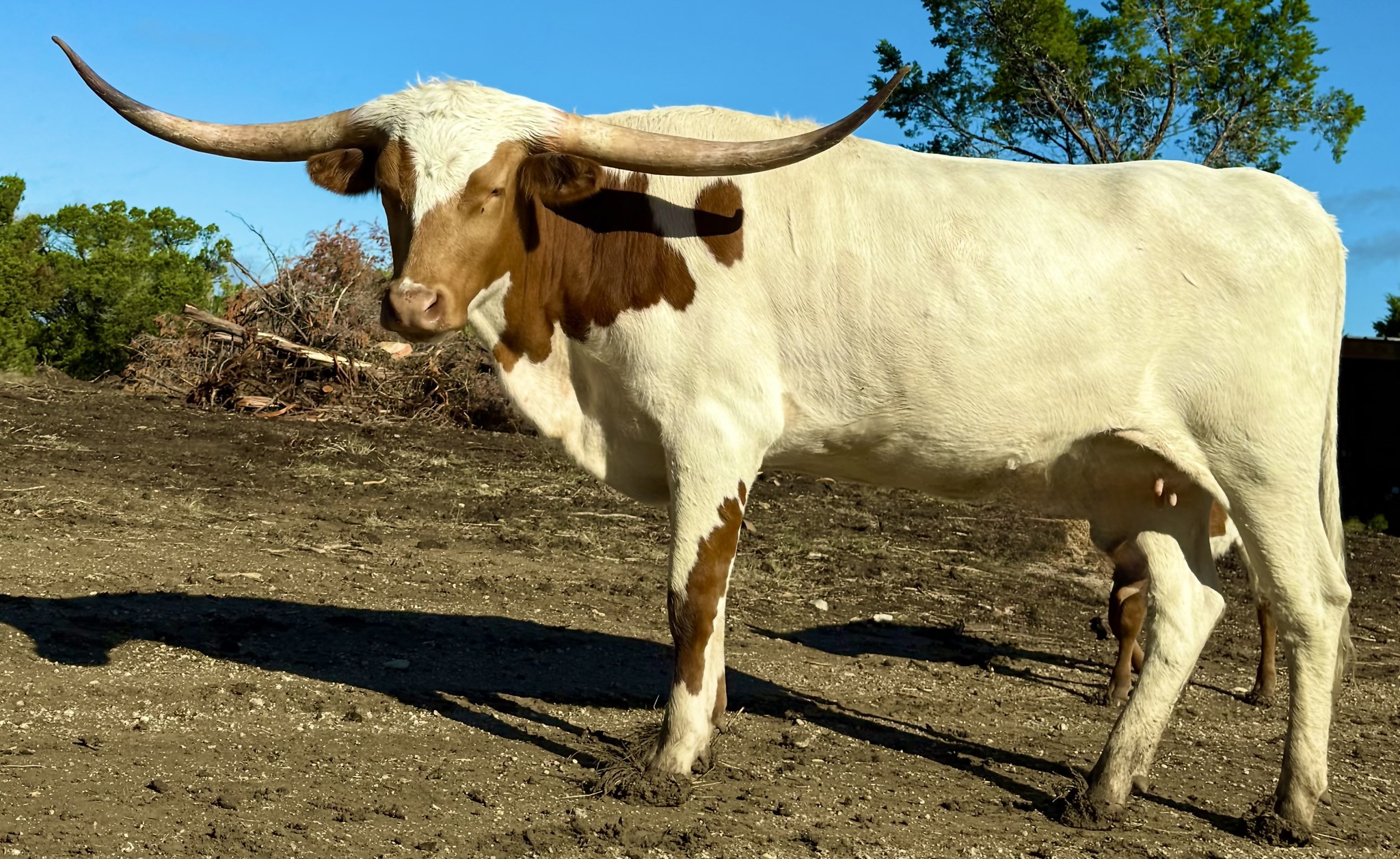 Combine puppy dog cuddle disposition with top of the line genetics and you get Stormy! She will literally nuzzle your hand against her face when you greet her. Her dam is over 93"TTT. Sire is KDK Hercules, 2023 HSC triple Bronze winner, who is 90"TTT before turning 3. Both are big bodied. Like her mamma, Stormy has a feminine face and a huge body with exploding horns. End of story!