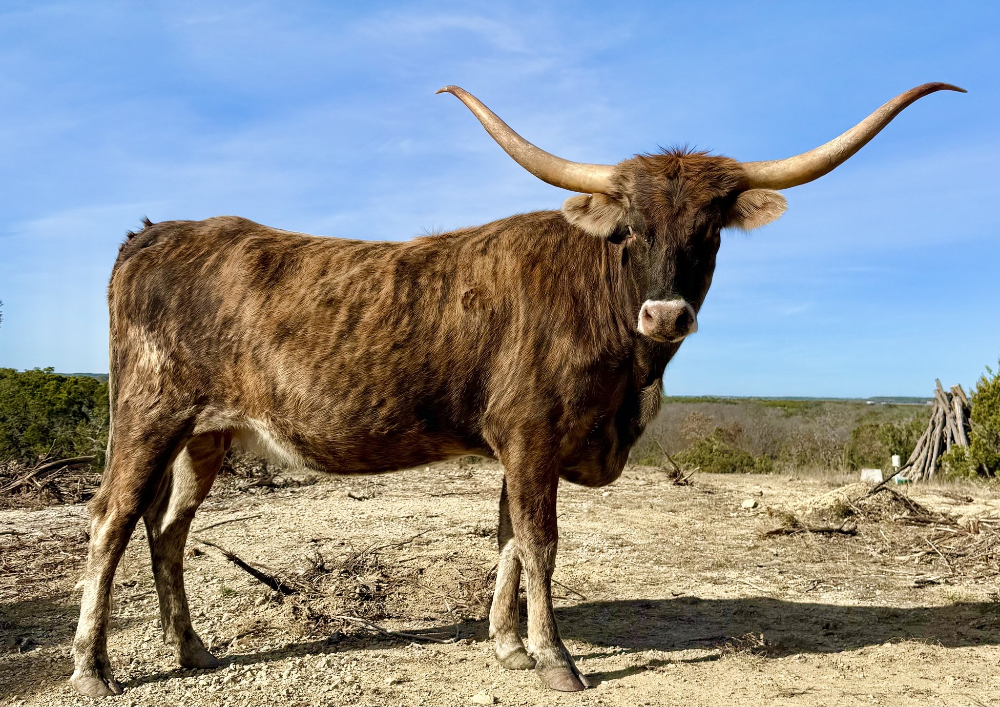 Twisty horned dam plus a frosty roan sire equals our brindle beauty. Bevelyn is destined to be a knock out!! Her horns are already rolling back and she started to brindle at an early age. As with most of our herd, she is gentle and eats cubes from our hands. Double bred Jamakizm--evident in her deep black and gold coat- flat, triple twist horns from the famed Becca line, with a dose of Monika and Miss Hot Stuff on top equals greatness!