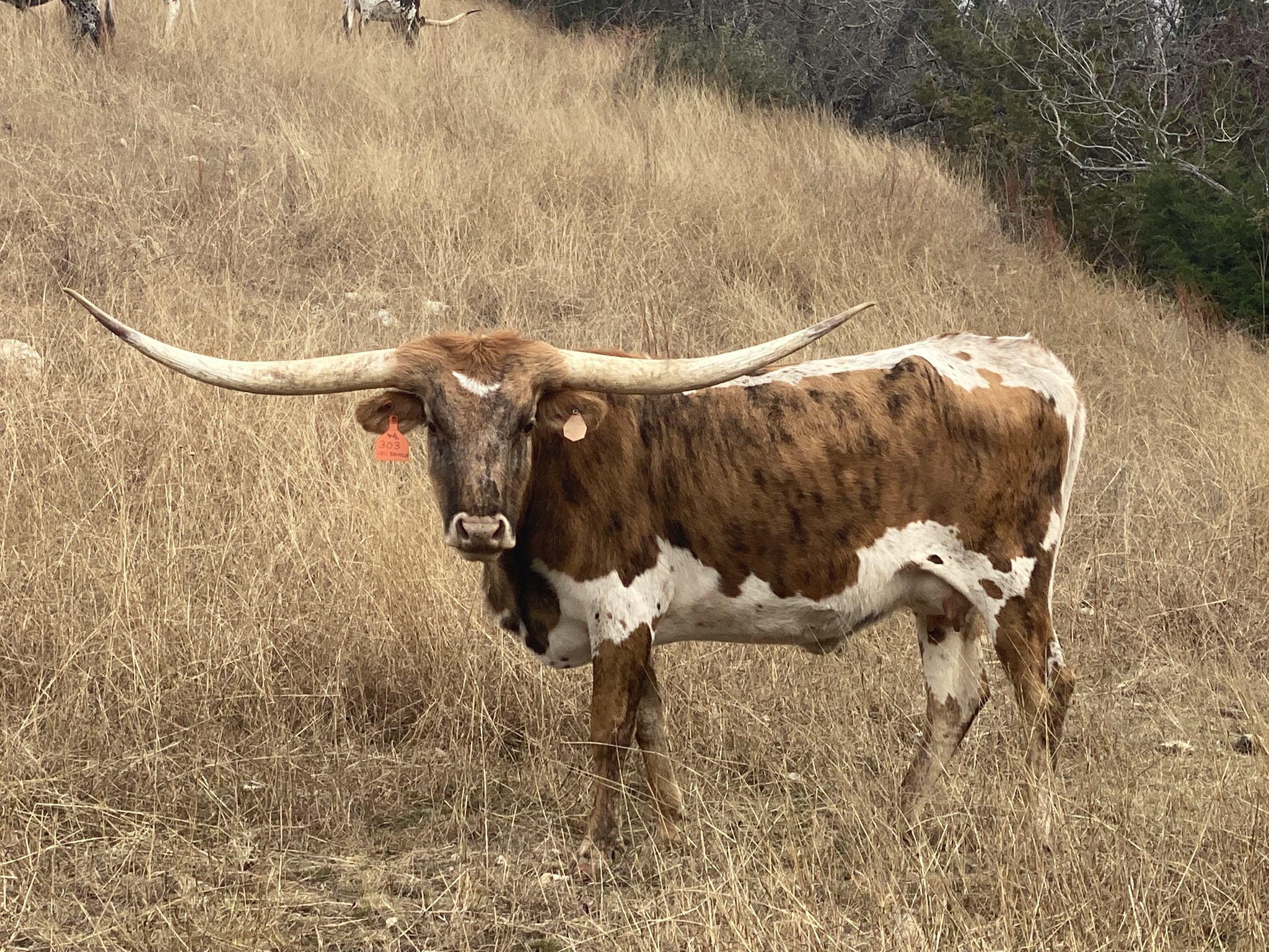 She was born on our ranch in the spring of 2023. She is out of a Concealed Weapon daughter and sired by a Cut'n Dried son. She is long, brindle, and easily has the most horn growth from our 2023 heifers!