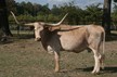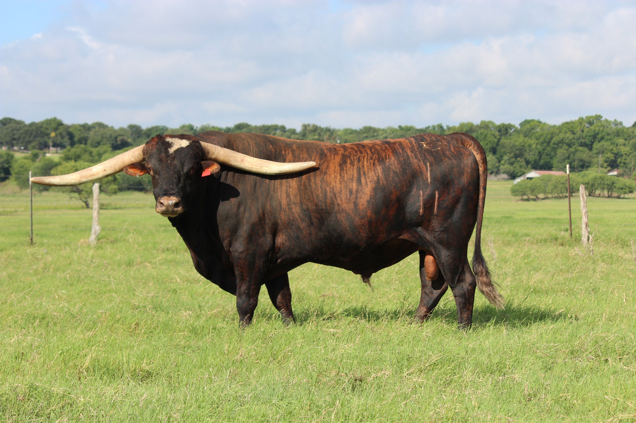 Senior herd sire with such names as Starlight, Gunman, WS Jamakizm and Jamakizm's Alphie(90") in his pedigree. He is a big bull with the dark brindle color of his granddad. He broke about 5 to 6 inches off each horn which would put him in the upper 80"s. Producing big bodied twisty horn cows.