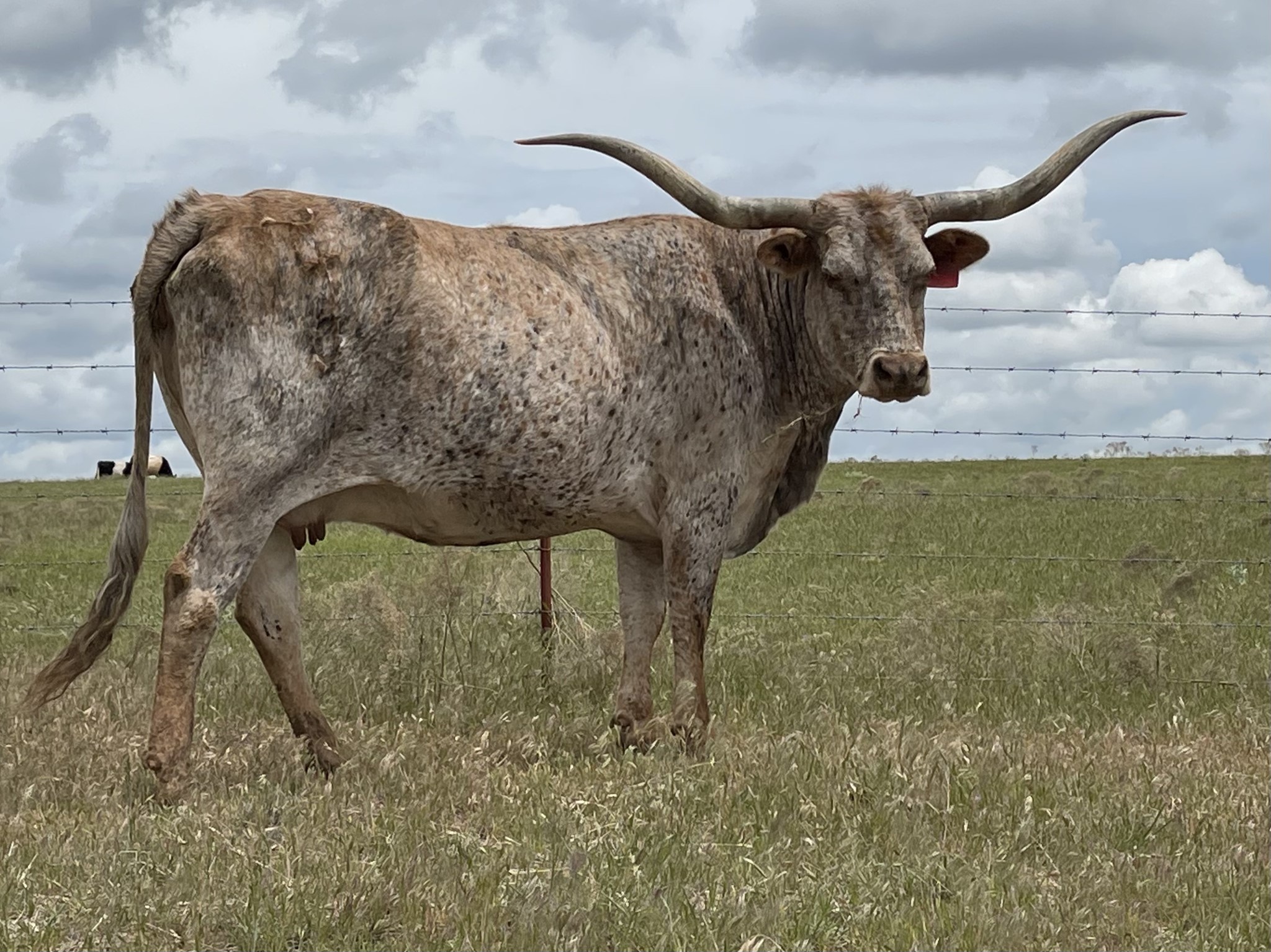 One of our favorite daughters of Juma. Produces outstanding color, size and horn! Sweetest girl in the pasture. Currently AI'ed to MC Hanging Tuff for Spring 2025