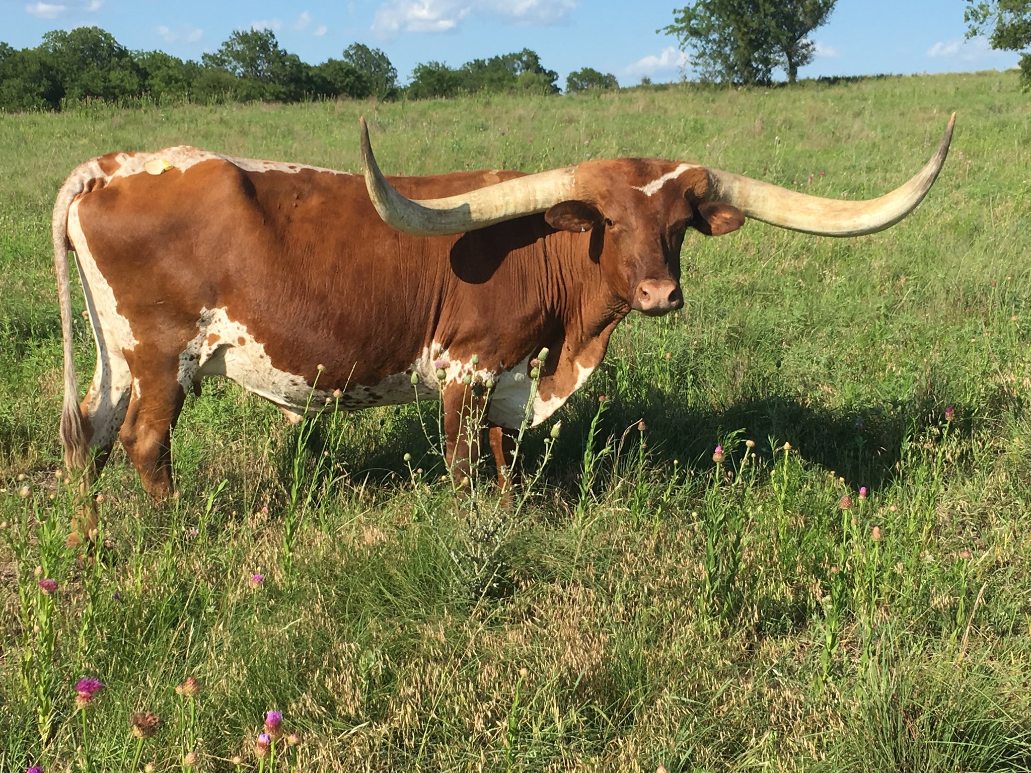 Cars wreck when viewing this cow. She has an amazing set of base on those horns and her conformation is perfect. We are breeding her to Winnie to continue that large frame and horn set. Just a stunning cow in the pasture.