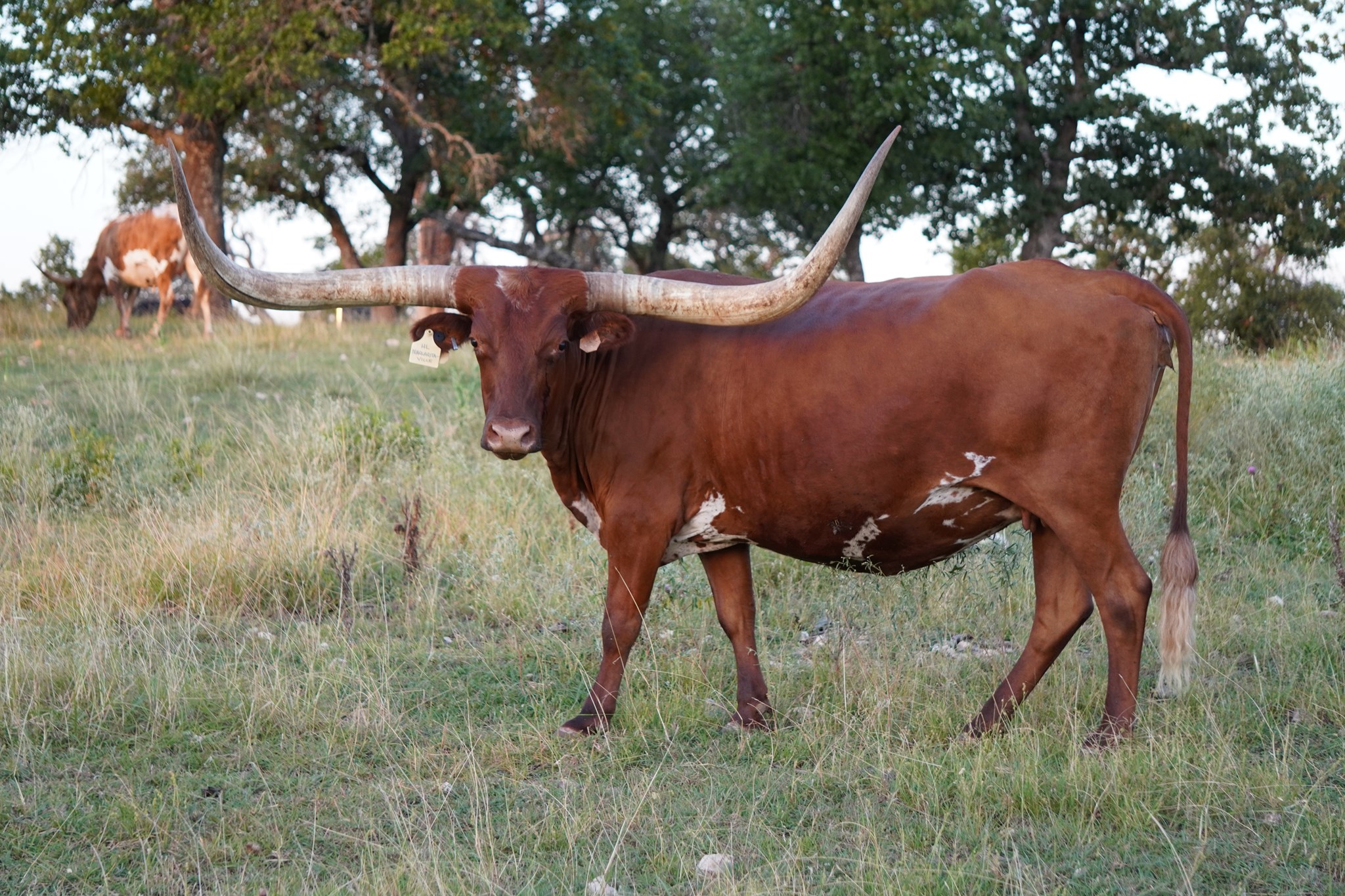We purchased her from G & P Longhorns in 2021. She is the sweetest cow on the ranch, never shying away from some handheld cubes. She doesn't have much TTT, but sure does have a lot of total horn. Don't let the smaller frame fool you, this girl throws big calves!