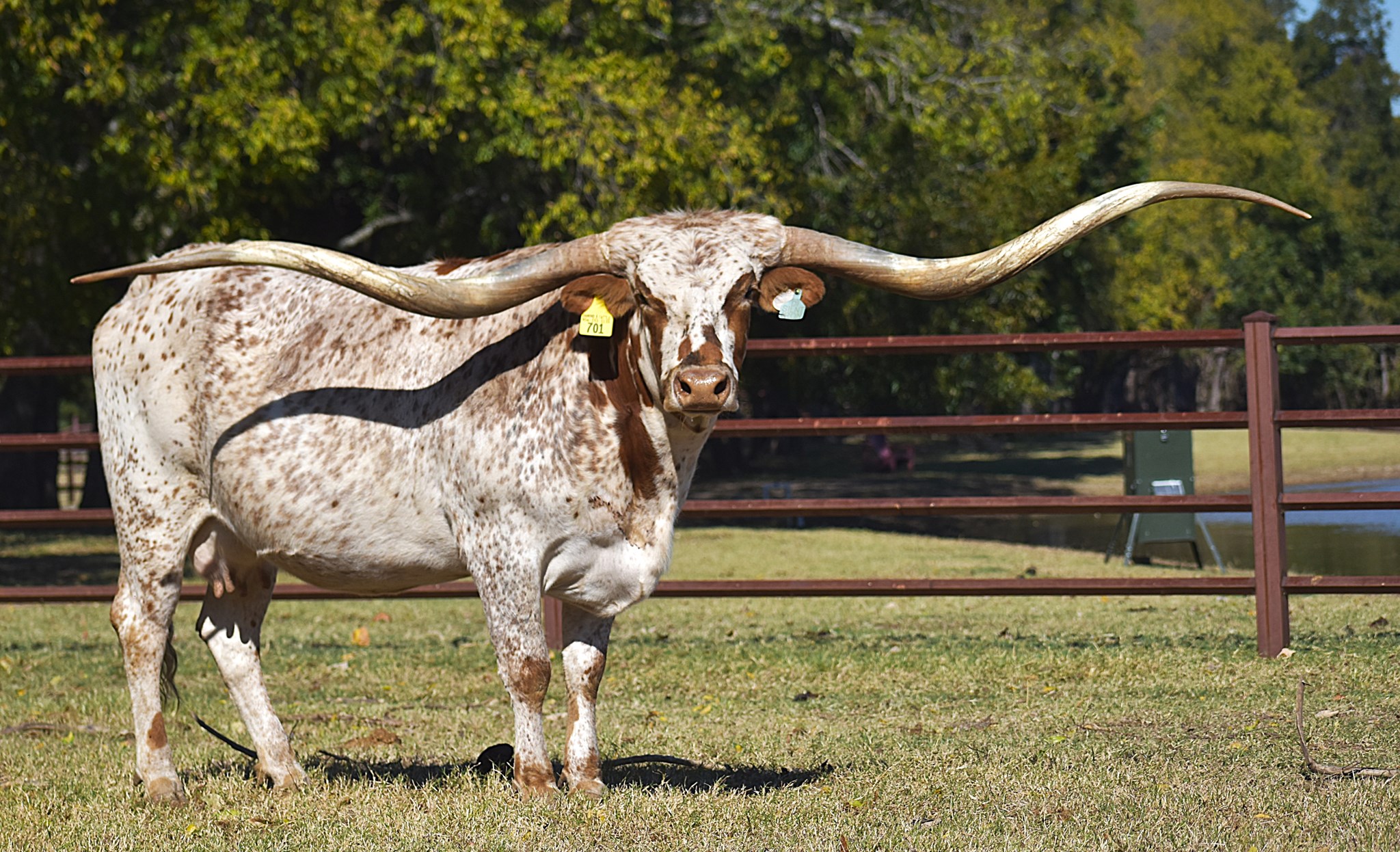 Silent Iron, enough said. She is perfection having body, horn, twist, and a pedigree. At age 11 she measured TTT horns at 115 inches. She is currently bred to the 100+ inch TTT horned Cut’n Dried, who weighs in at 2,000+ pounds, one of only a few Longhorns in the world that weighs over a ton and sports 100+ inches of horn. Enough said.