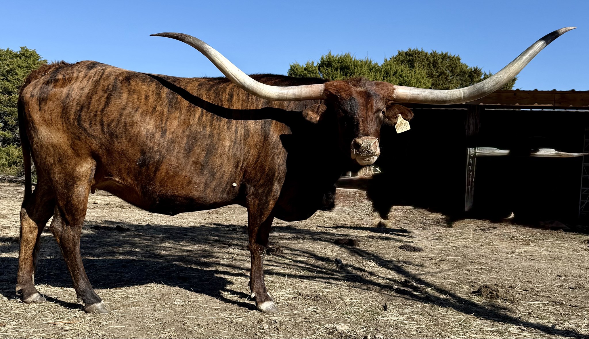 Stunning, tall, big bodied bundle of brindle, this Jamakizm daughter is solid gold and black, topped with horns that gently slope to reach 93"!!! Aptly named, Sunny will warm your heart with her friendly disposition when she eats as many treats as she can from your hand!