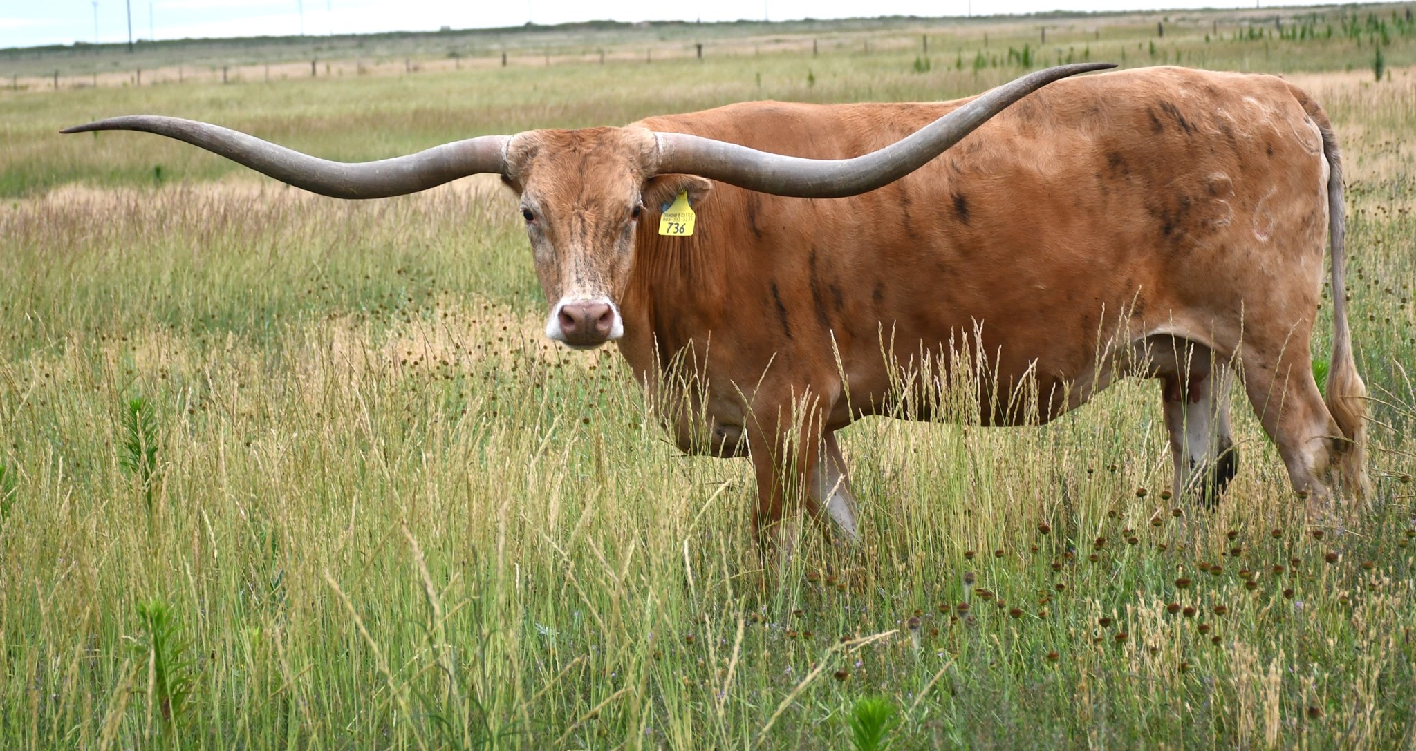 Fifty-Fifty daughter over the 90" tip-to-tip mark and could be a 100" cow someday. Check out her prodigy, she knows how to produce a fine calf to carry on the Fifty-Fifty genetic line.